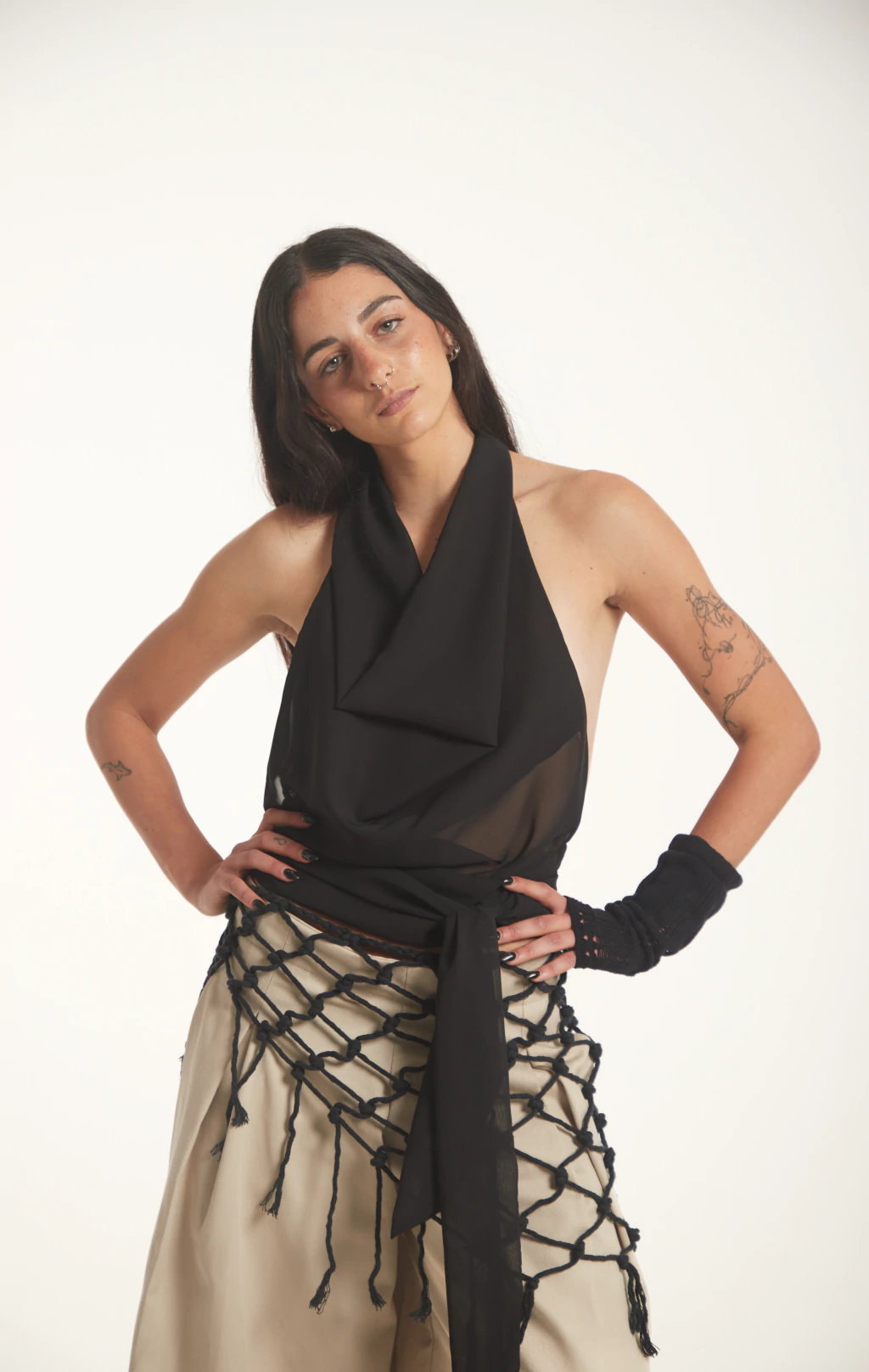 Top confeccionado en 100% gasa, con espalda abierta y tiras largas para regular como usarlo.